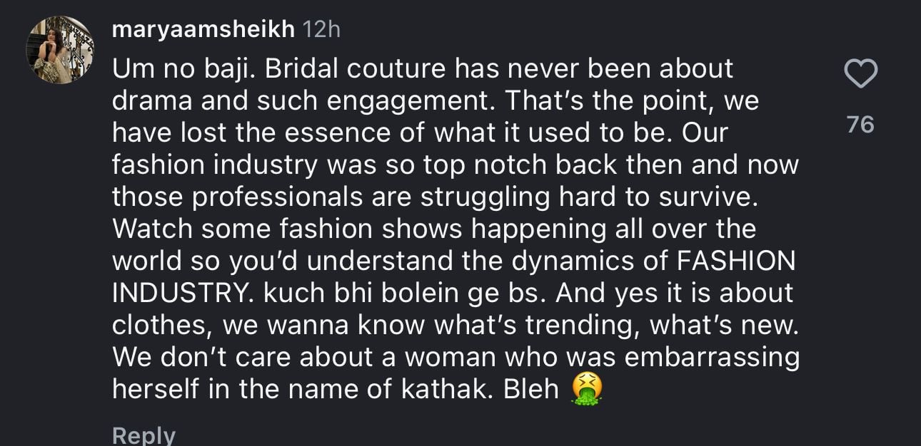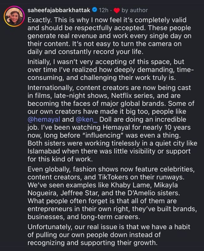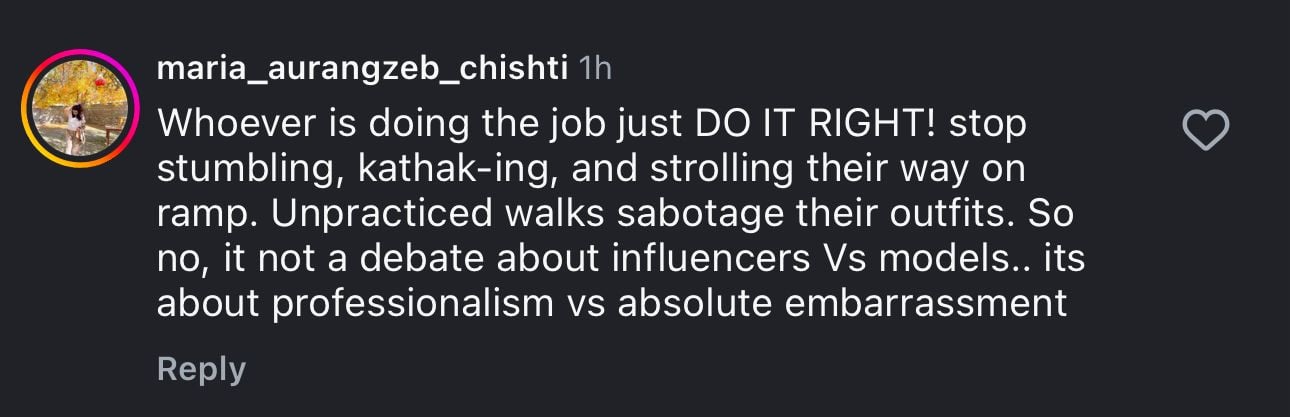 On the other side of the discussion, supporters argue that influencers are often chosen for their reach and visibility, which can extend a designer’s audience beyond the runway. In a widely shared comment, model Saheefa Jabbar Khattak wrote that the space should be “respectfully accepted,” saying content creators “generate real revenue” and that “all of them are entrepreneurs in their own right, they’ve built brands, businesses, and long-term careers.” The comment also referenced international examples of creators appearing in mainstream entertainment and brand campaigns.