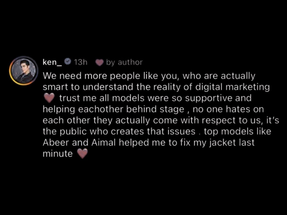 Some creators have also responded to the tone of the conversation. Content creator Ken, who walked the runaway for Vestido1: “trust me all models were so supportive and helping each other behind stage, no one hates on each other… it’s the public who creates that issues,” adding that “top models like Abeer and Aimal helped me to fix my jacket last minute.”