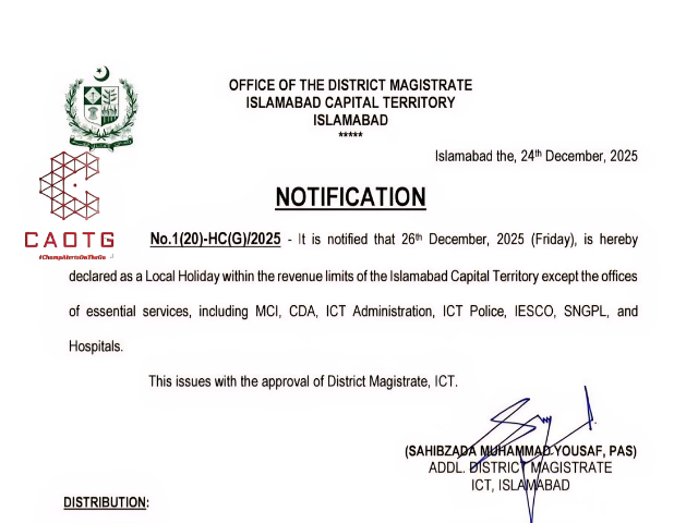 According to a notification issued by the Islamabad district administration, a local holiday will be observed within the limits of the Islamabad Capital Territory (ICT) on December 26.