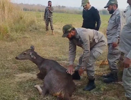 Officials said a female sambar deer that had strayed from its natural habitat in the Gujrat region was safely rescued during a wildlife protection operation.