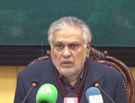 Deputy Prime Minister and Foreign Minister Ishaq Dar addresses a press briefing in Islamabad on Friday to review Pakistan’s diplomatic performance in 2025. SCREENGRAB