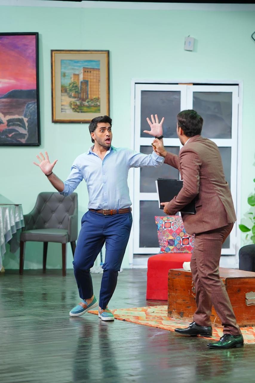 The play’s length isn’t an issue—it’s thoroughly entertaining—but the late entry of Azeem Bachchan (also played by Yasir Hussain) is. While he energises both the audience and his co-stars as a Pakistani version of Amitabh Bachchan, his appearance comes a bit too late. Gulrukh Ali Khan, who plays Sherry’s girlfriend, has limited material to work with; a few more dialogues could have added better representation for the fairer sex.