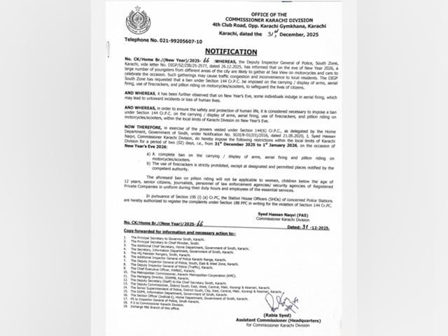 Karachi Commissioner Syed Hassan Naqvi has imposed a two-day ban on pillion riding, the carrying or display of arms, aerial firing, and the use of fireworks ahead of New Year's Eve celebrations.