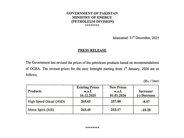 Additionally, the price of high-speed diesel (HSD) has been slashed by Rs8.57 per litre, with the new price set at Rs257.08 per litre. The Petroleum Division issued a notification confirming these changes, stating that the new prices will be effective from midnight tonight and will remain in place until January 15, 2026.