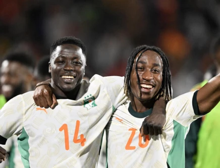 Oumar Diakite (L) and Yan Diomande celebrate in Marrakesh after Ivory Coast topped Group F at the Africa Cup of Nations. Photo: AFP