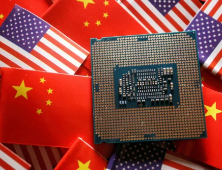 A central processing unit semiconductor chip is displayed among flags of China and US, in this illustration picture taken February 17, 2023. PHOTO: REUTERS