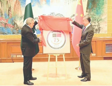 During the visit, Dar and Wang jointly unveiled the logo marking the 75th anniversary of the establishment of Pakistan-China diplomatic relations, formally launching year-long celebrations.