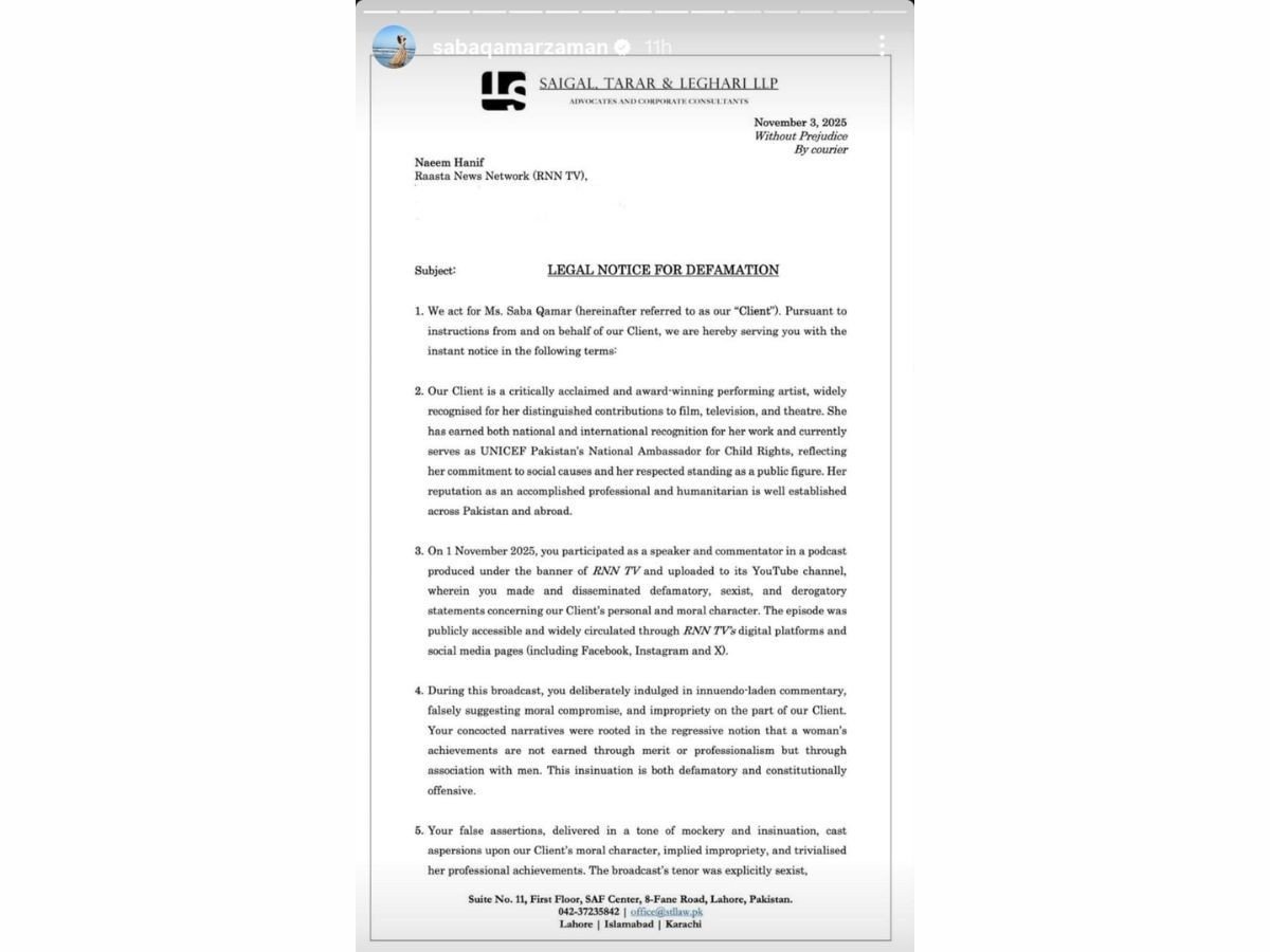 According to the legal notice, Hanif had “made and disseminated defamatory, sexist and derogatory statements concerning [Qamar’s] personal and moral character,” while promoting the “regressive notion that a woman’s achievements are not earned through merit or professionalism but through association with men.”