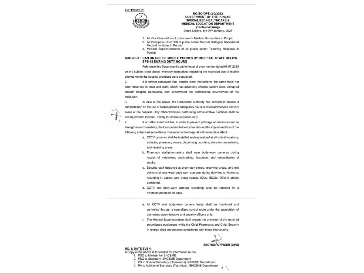 Under the directive, hospital staff in grades below BPS-18 are prohibited from using mobile phones while on duty, particularly in clinical and service delivery areas. The department said the decision was taken after taking serious notice of mobile phone use affecting patient care.