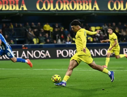Villarreal forward Georges Mikautadze prepares to score his side’s third goal during their La Liga match against Deportivo Alavés at the La Cerámica Stadium. Photo: AFP