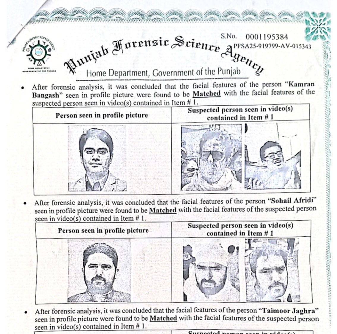 The report states that the profile photographs of Sohail Afridi, Irfan Saleem, Kamran Bangash and Taimur Jhagra were matched with individuals appearing in the videos. In all four cases, the individuals in the footage were confirmed to be the same persons as in their respective profile images.