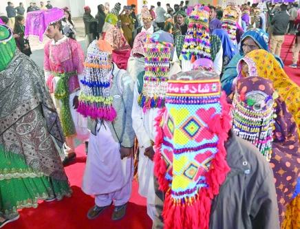Couples, their families, and guests from Sindh and other provinces arrived at the venue through specially arranged transport, including buses and vehicles. The venue was beautifully decorated with electric lights and vibrant illumination, while guests were warmly welcomed with the melodious sounds of shehnai, traditional drumbeats, and cultural dances. Strict security arrangements were also in place throughout the event.