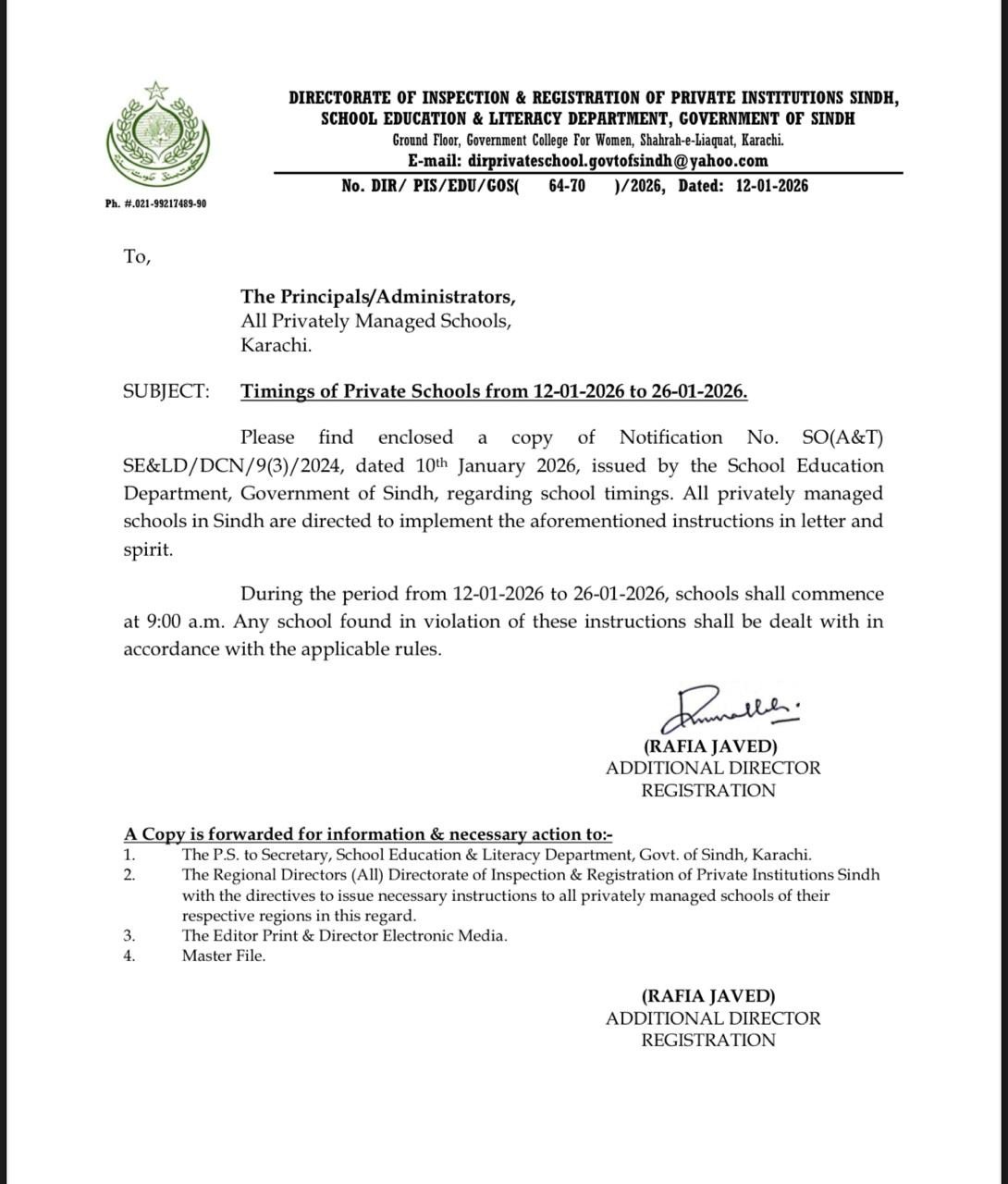 The Sindh Directorate of Private Institutions has issued a stern warning to private schools for failing to comply with the Sindh government's winter timings directive, threatening legal action for non-compliance.