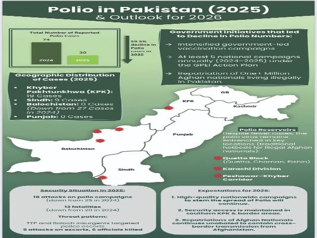 Last year, Pakistan reported 20 cases from the K-P, nine from Sindh, and one each from Punjab and Gilgit-Baltistan. Southern K-P accounted for more than half of Pakistan's WPV1 cases in 2025, with 17 of the country's 31 cases reported from the region.