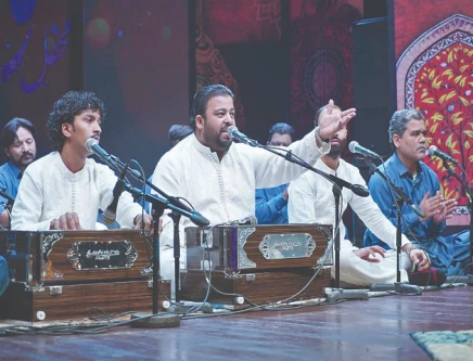 Mustafa Abu Muhammad Qawwal & Brothers present powerful, melodious performances to an enthusiastic audience at a Qawwali Night hosted by the PNCA in Islamabad. Photo: Express