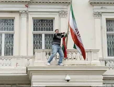 A protester who climbed across multiple balconies onto a terrace at Iran's embassy in London and removed a flag remained in custody on Saturday as police said they had also arrested 13 other people.