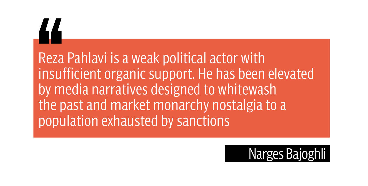 “Revolutions are not vibes,” Narges Bajoghli, co-director of the Rethinking Iran Initiative and a professor at Johns Hopkins, told Dropsitenews. Both the Islamic Republic and its external adversaries, she explained, have actively worked to prevent a “real opposition” from taking shape. Speaking further, Bajoghli argued that the regime's enemies and the exiled opposition forces do not want “an Iran that is democratic and actually sovereign.” She described Reza Pahlavi as “a weak political actor” with insufficient “organic support,” elevated instead by media narratives designed to “whitewash the past” and market monarchy nostalgia to a population exhausted by sanctions, repression, and economic collapse.
