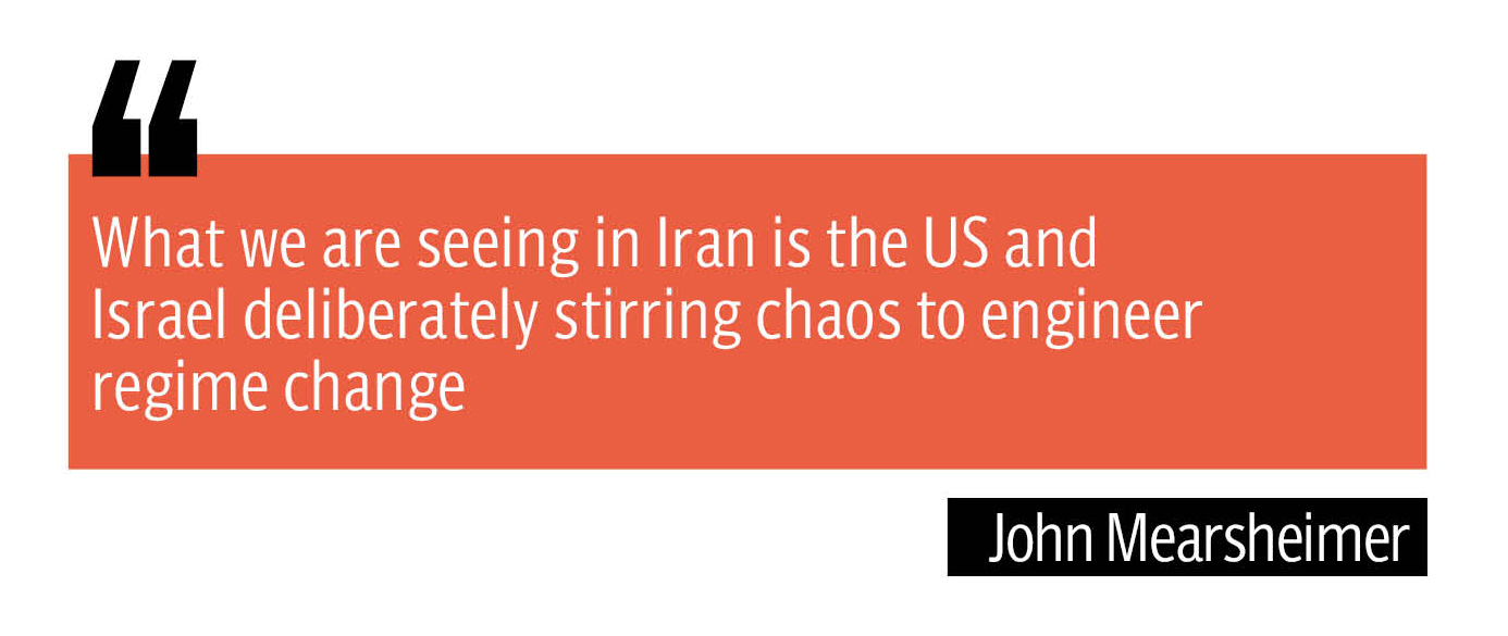 Mearsheimer lays bare what is really happening. This is not some spontaneous grassroots uprising. “What we are seeing in Iran is the US and Israel deliberately stirring chaos to engineer regime change,” he explains. Western audiences, the University of Chicago international relations theorist notes, were fed a familiar story – the Iranian regime mismanages the country, the people rise up, and the government is on the verge of collapse. That story, Mearsheimer says, is pure fiction.