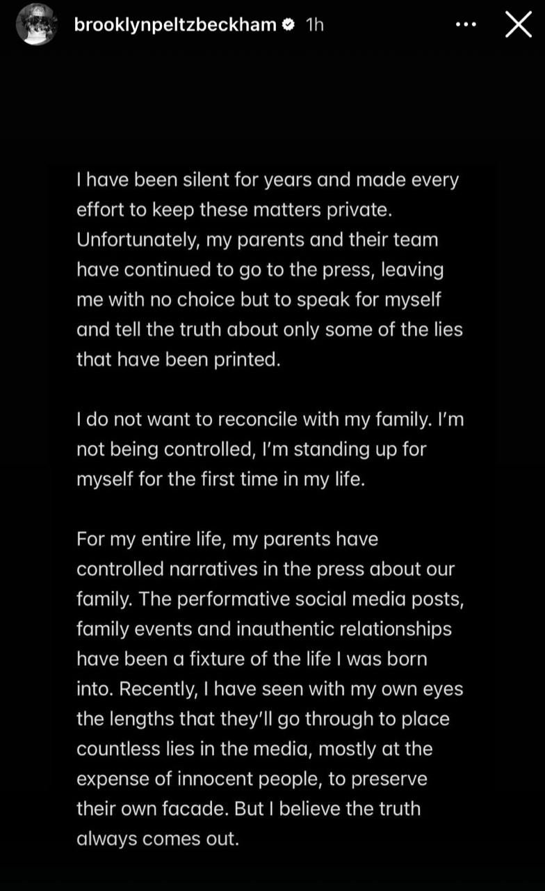 “I do not want to reconcile with my family,” Brooklyn stated, adding that he is “standing up for myself for the first time in my life.” He accused his parents of controlling narratives about their family through media coverage, social media posts, and public appearances, which he described as “performative.”