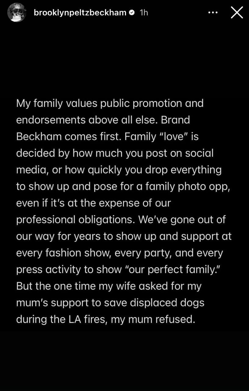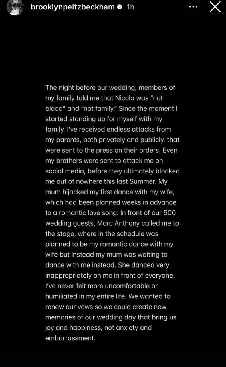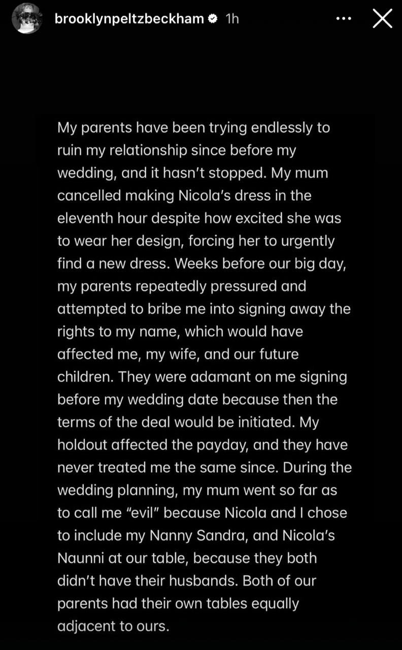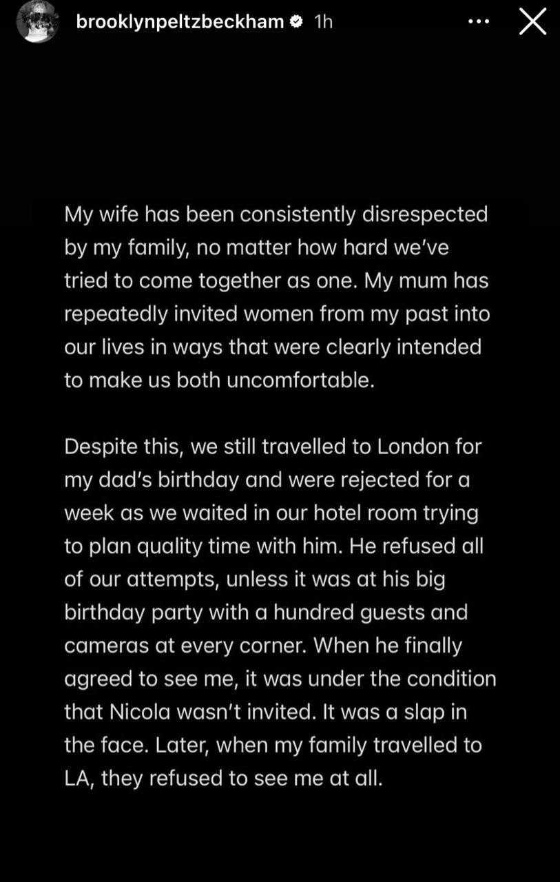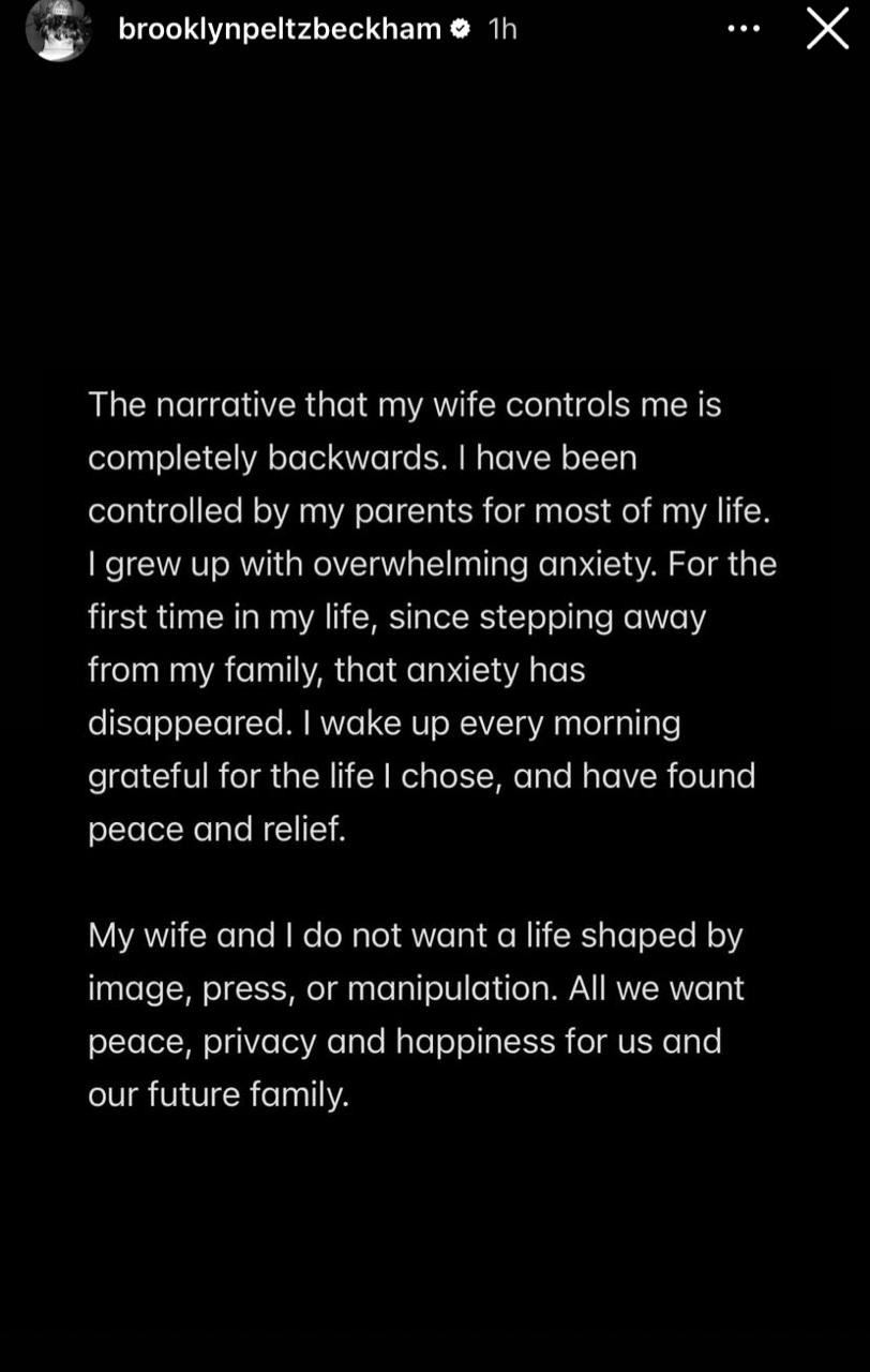 The statement also referenced Brooklyn’s mental health, with the photographer and aspiring chef saying he experienced “overwhelming anxiety” growing up. He claimed that stepping back from family relationships has resulted in improved emotional well-being.