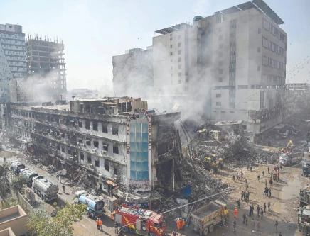 Rescue workers search amid the debris using excavators after a massive fire at a shopping mall in Karachi. Photo: AFP