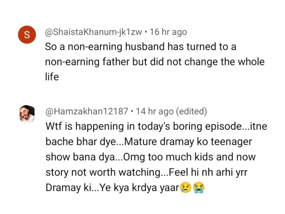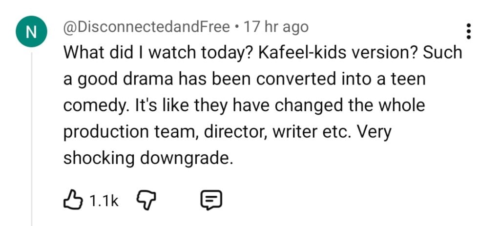 Another user agreed saying, "What did I watch today? Kafeel-kids version? Such a good drama has been converted into a teen comedy. It's like they have changed the whole production team, director, writer, etc. Very shocking downgrade."