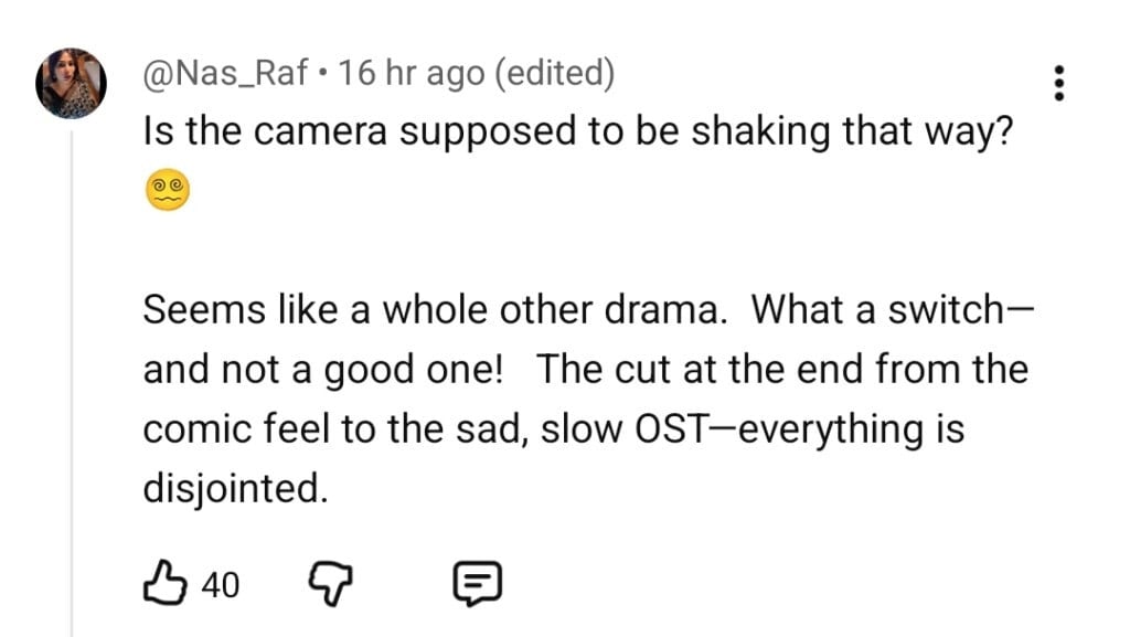 Many fans expressed disappointment over the tonal change. Social media reactions suggested that what was once a serious family drama now felt like a parody of the original show, including the direction. One user noted, "Is the camera supposed to be shaking that way? Seems like a whole other drama. What a switch - and not a good one! The cut at the end from the comic feel to the sad, slow OST - everything is disjointed."