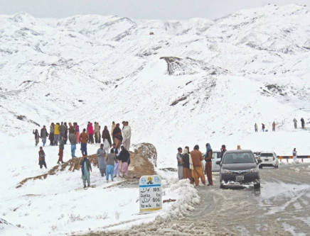 People gather along a snow-covered area near the Pak-Afghan border in Chaman. Photo: AFP