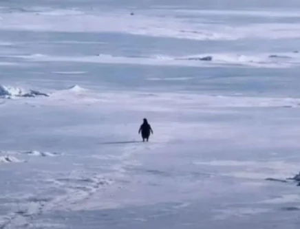 A lone penguin waddling away from its colony and toward a distant mountain range has become one of 2026’s most unexpected viral sensations.