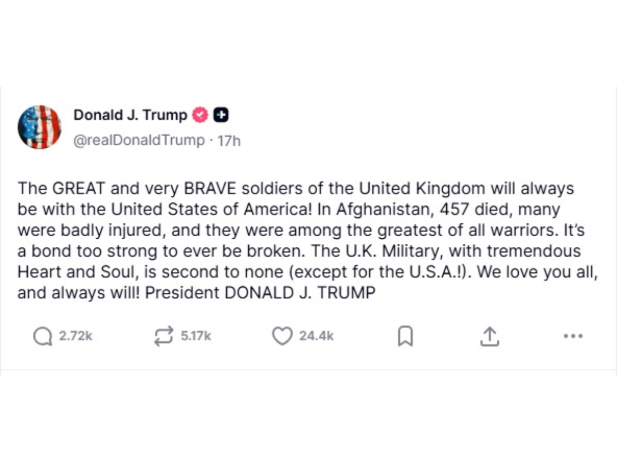 "The GREAT and very BRAVE soldiers of the United Kingdom will always be with the United States of America!" Trump wrote on Truth Social. He added, "In Afghanistan, 457 died, many were badly injured, and they were among the greatest of all warriors. It's a bond too strong to ever be broken".
