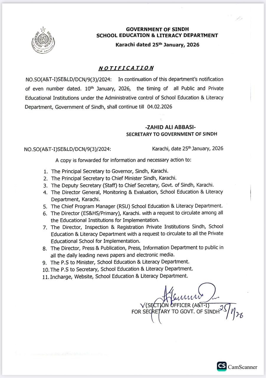 It may be recalled that on January 10, the Sindh government had revised school timings across the province amid severe cold weather. Sindh Education Minister Sardar Shah had directed the adjustment of school hours to help students cope with the cold, following which the Education Department issued an official notification stating that both public and private schools would open at 9am, while closing times would remain unchanged.