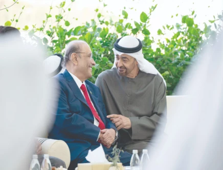 President Asif Ali Zardari shares a light moment with UAE President Sheikh Mohamed bin Zayed Al Nahyan in Abu Dhabi. Photo: APP