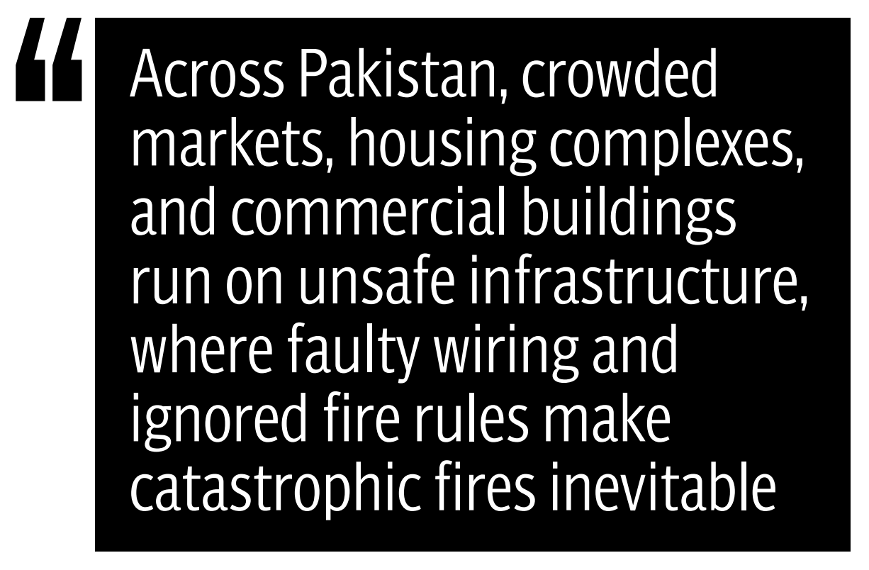 Beyond the ineffable loss of lives and livelihoods, the Gul Plaza tragedy is a grim reminder of what happens when safety measures are treated as optional and enforcement as an afterthought. Across Pakistan, densely populated markets, residential complexes, and commercial buildings operate in hazardous conditions, where outdated wiring and ignored fire regulations make catastrophic fires not a question of “if” but “when”. This latest disaster is a wake-up call: without systemic reform, stricter enforcement, and widespread public awareness, more lives will continue to be lost to preventable fires, leaving the nation to grieve over a repeating tragedy that could, and should, have been avoided in the first place.