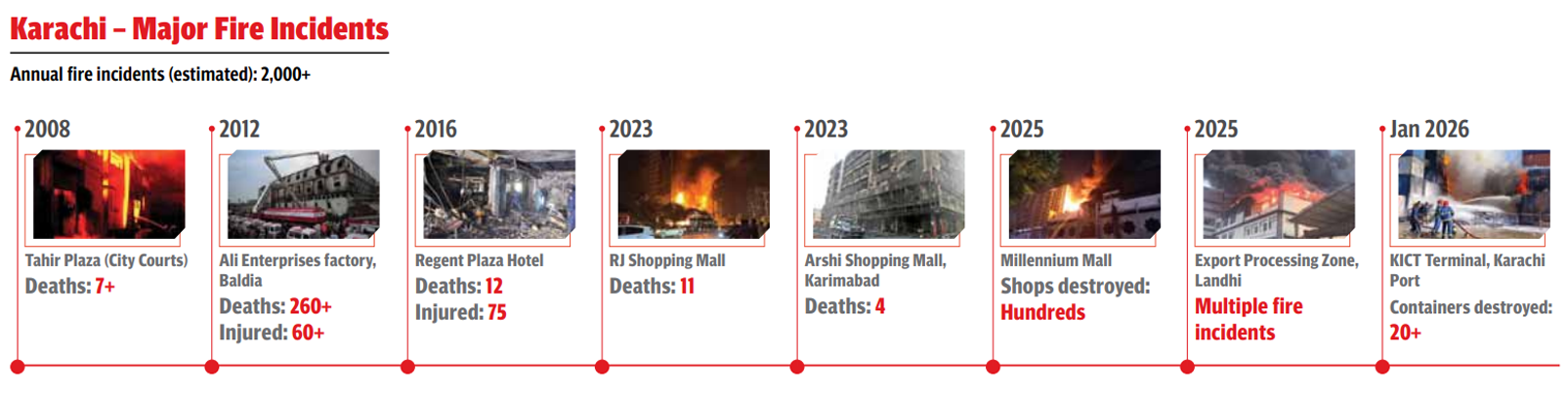 Pakistan’s cities have a long history of fatal fires, with Karachi witnessing some of the deadliest incidents. In 2012, a blaze at a garment factory in Baldia Town killed over 260 workers and injured around 60, while a 2016 fire at Regent Plaza Hotel on Shahrah-e-Faisal claimed 12 lives and left 75 injured. In December 2023, a fire at the RJ Shopping Mall on Rashid Minhas Road killed 11 people, and in the same year, a fire at Arshi Shopping Mall in Karimabad killed four people. Similarly, in June 2025, a fire at Millennium Mall destroyed hundreds of shops, resulting in losses running into hundreds of millions of rupees.