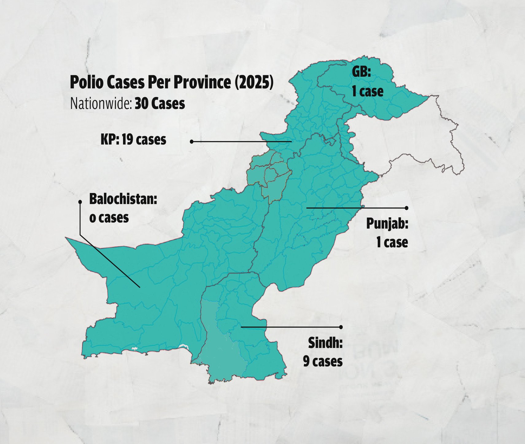 According to statistics from the National Emergency Operations Centre (NEOC), the highest number of polio cases, 2,635, was reported in 1994, after which a steady decline in cases was observed. In 2025, a total of 30 cases were reported from across the country, with the highest number (19) recorded in Khyber-Pakhtunkhwa (K-P), nine recorded in Sindh, and one each in Punjab and Gilgit-Baltistan (G-B). In K-P, the worst affected province, the majority of cases originated from North Waziristan, Lakki Marwat, Tank, Dera Ismail Khan, Lower Kohistan, Torghar, and Bannu. Unsurprisingly, these are the same regions where vaccination attempts have long been marred by a lethal mix of foreign conspiracy theories and entrenched local resistance.