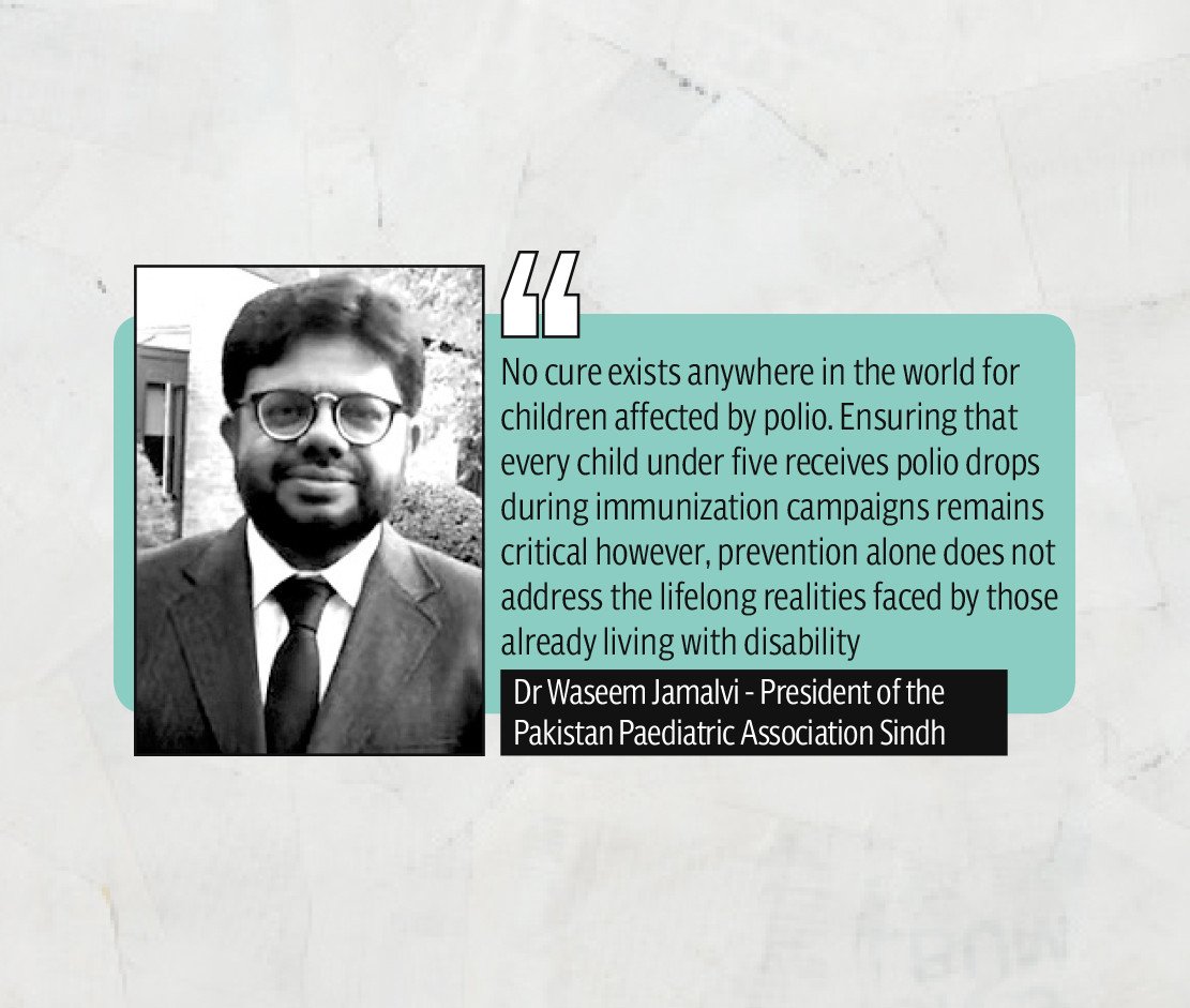 Professor Dr Waseem Jamalvi, a paediatrician at Dow University of Health Sciences and President of the Pakistan Paediatric Association Sindh, underscored that no cure existed anywhere in the world for children disabled by polio. “The virus impacts each child differently, but those with weaker immunity face a significantly higher risk of infection. Paralysis caused by polio cannot be reversed because the virus permanently destroys nerve cells. Ensuring that every child under five receives polio drops during immunisation campaigns remains critical however, prevention alone does not address the lifelong realities faced by those already living with disability,” noted Dr Jamalvi.