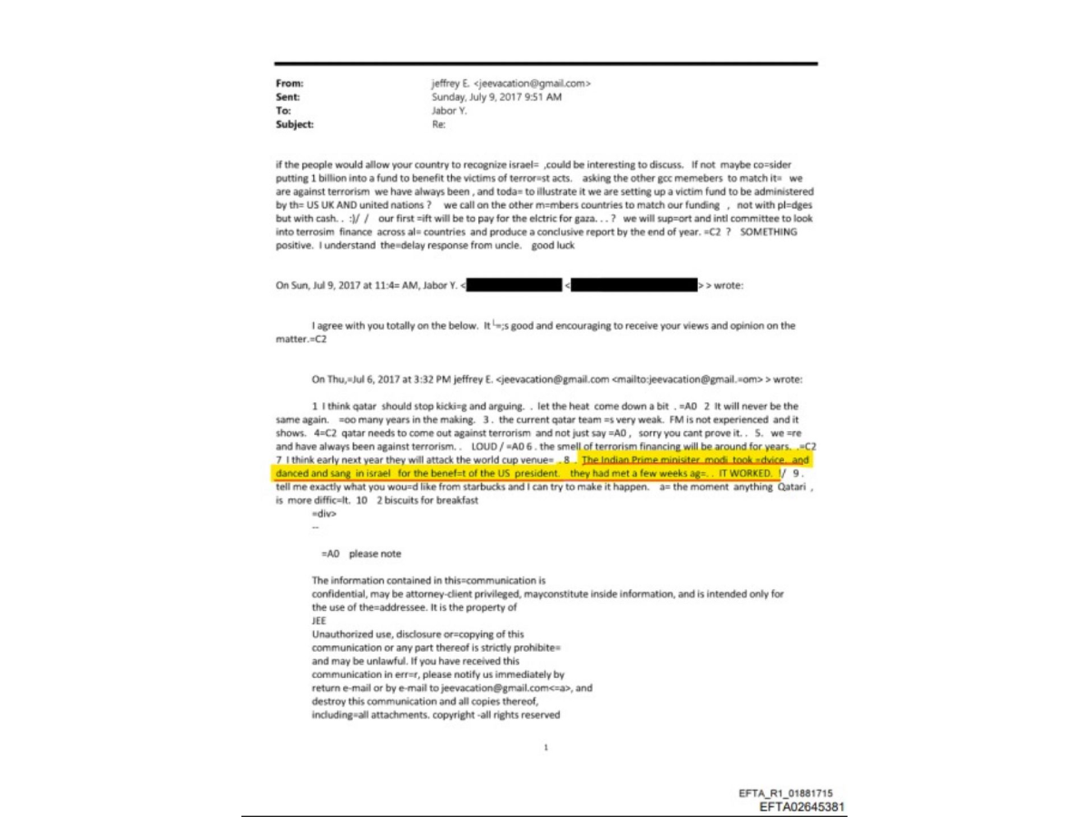 Among the documents was a July 2017 email sent by Epstein to a person identified as Y. Jabor, in which he referred to Modi’s trip to Israel.
