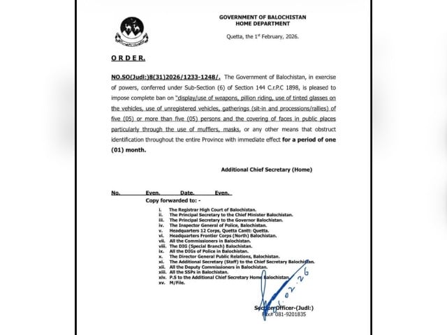 The decision took immediate effect and will remain in force from February 1 until the end of February, according to an official notification issued by the Balochistan Home Department on Sunday.