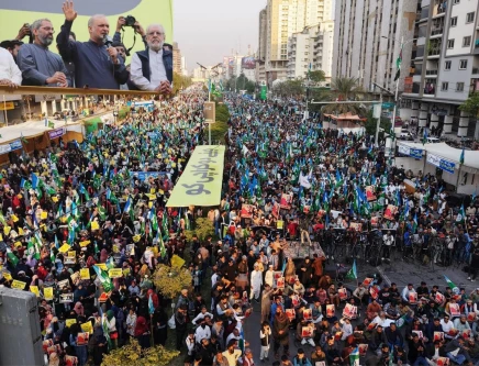 In the backdrop of Gul Plaza Tragedy, tens of thousands of Karachiites, including women, children and senior citizens, marched on Shahrah-e-Faisal to record their anguish over the Pakistan Peoples Party (PPP) government that resulted in over 80 deaths.