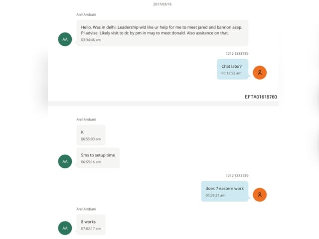Ambani texted Epstein, “Hello. Was in delhi. Leadership wld like ur help for me to meet jared and bannon asap. PI advise. Likely visit to dc by pm in may to meet donald. Also assitance on that.” Epstein and Ambani proceeded to set up a time to chat. A few messages later, Ambani texted, “Thanks as always.” Epstein responded, “Fun.”