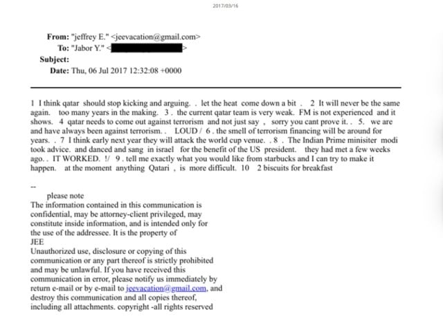 On July 6, 2017, as Modi concluded his historic visit to Israel, an elated Epstein wrote to an individual identified in the emails as Jabor Y, identified in past reporting as an individual with ties to Qatar’s former prime minister, Hamad bin Jassim bin Jaber Al Thani. “The Indian Prime Minisiter Modi took advice. and danced and sang in Israel for the benefit of the US president,” Epstein wrote. “they had met a few weeks ago.. IT WORKED. !”