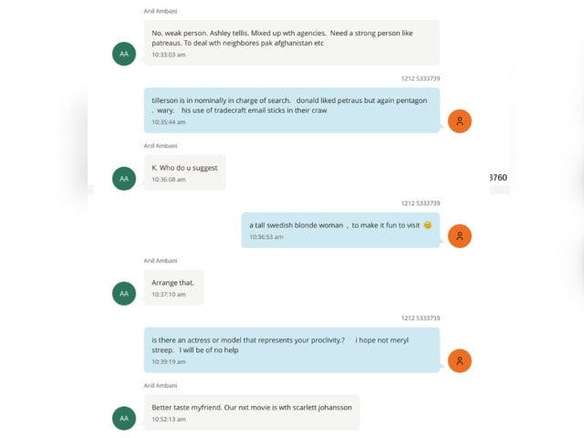 Epstein responded that although Trump liked Petraeus, the Pentagon was wary of that choice, to which Ambani replied, “K. Who do u suggest.”