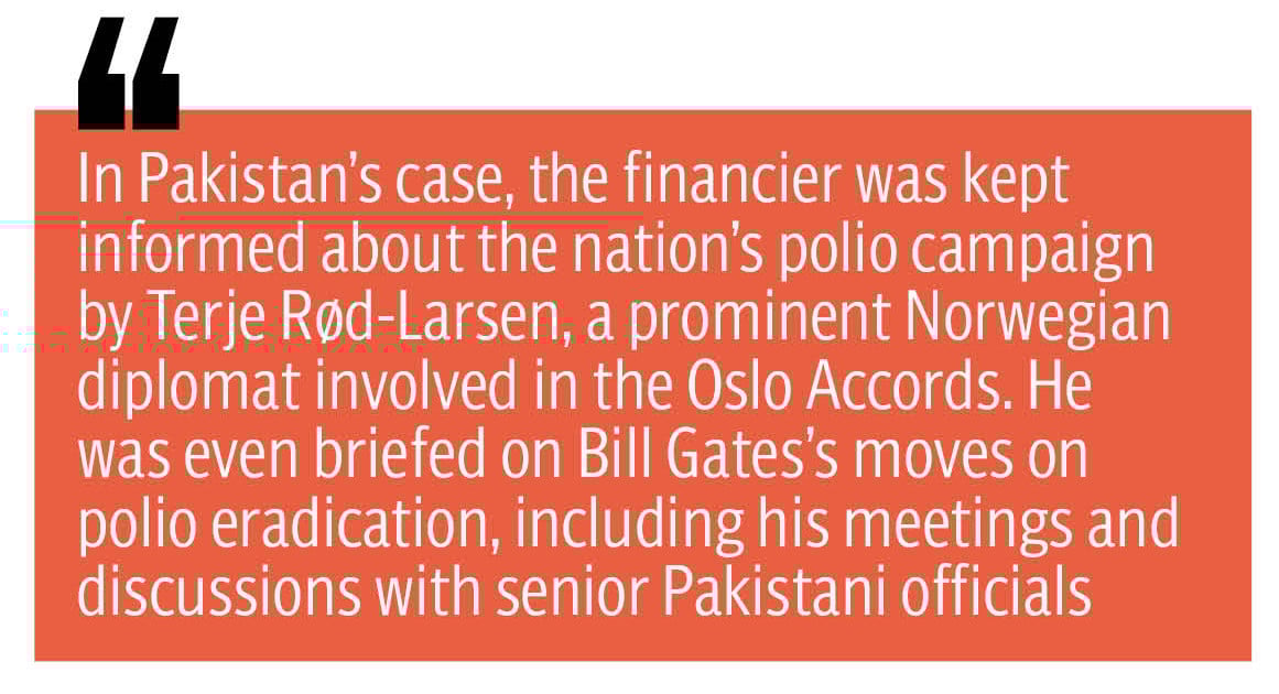 In Pakistan's case, it appears the nation's polio programme remained on Epstein's radar. The financier was being updated about the situation by Terje Rod-Larsen, a prominent Norwegian diplomat known for his role in the Oslo Accords.