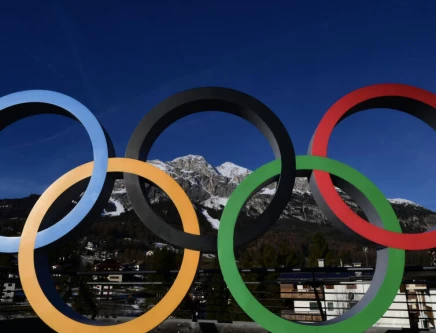 The Olympic rings at Cortina d'Ampezzo, where the women's Alpine skiing will take place. Photo: AFP