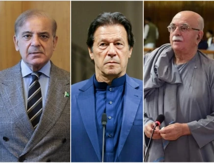 Prime Minister Shehbaz Sharif (L), PTI Founder Imran Khan (C) and Mahmood Khan Achakzai. Photo: File
