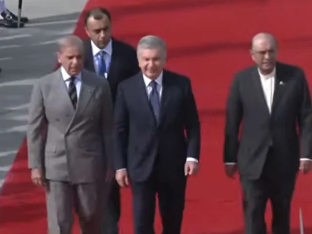 On arrival at Nur Khan Airbase, President Asif Ali Zardari and Prime Minister Shehbaz Sharif welcomed the Uzbek president. Federal Minister for Information and Broadcasting Attaullah Tarar and Special Assistant Haroon Akhtar Khan were also present.