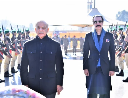 Prime Minister of Pakistan Muhammad Shehbaz Sharif and Prime Minister of Azad Jammu and Kashmir Raja Faisal Mumtaz Rathore laying floral wreath at Azad Jammu and Kashmir Yadgar-e-Shuhada on the occasion of Kashmir solidarity day. PHOTO: X (GOV OF PAKISTAN)