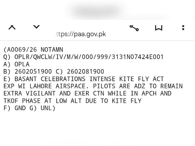 In a Notice to Airmen (NOTAM), the authority said heavy kite flying is expected in Lahore, particularly during aircraft take-off and landing phases at low altitude.