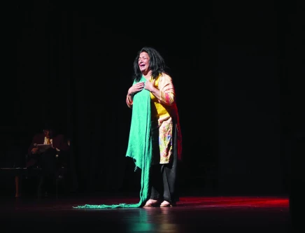 Theatre actor deliver a powerful performance depicting the pain and hardships faced by Kashmiris under occupation, during a play organised by PNCA on Kashmir Solidarity Day. Photo: Express