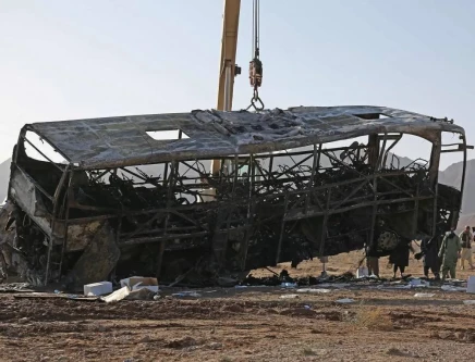 The wreckage of a bus is towed at the site of a crash in Guzara district of Herat province on August 20, 2025. FILE PHOTO: AFP